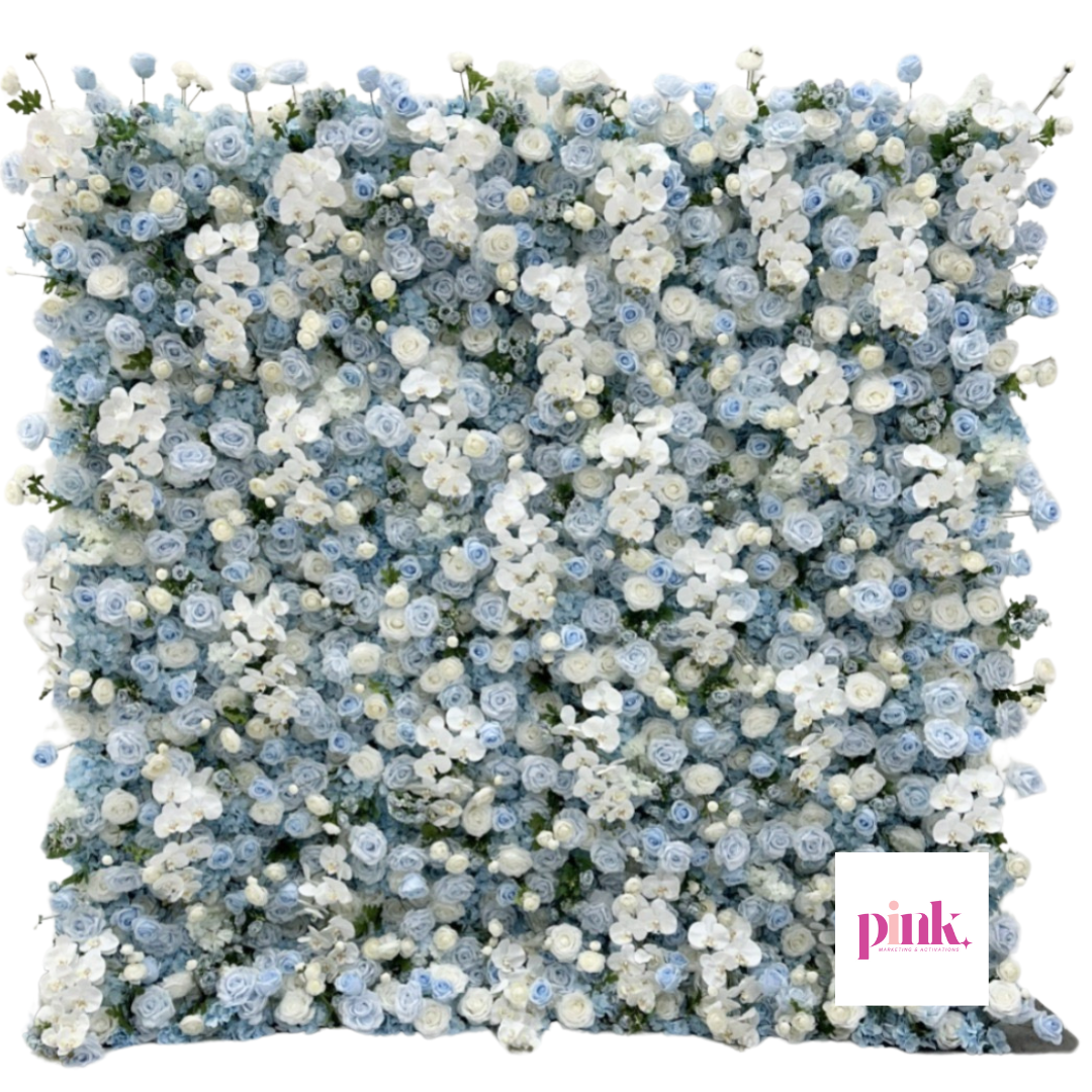 8’x8′ Baby Blue and White Luxury Faux Flower Wall